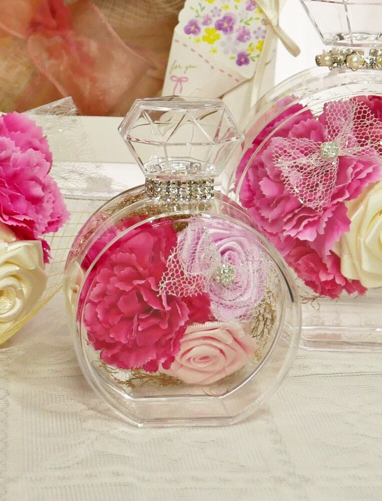 母の日におススメ!プロフーモアレンジミニ・カーネーションは、心を込めたギフトにぴったりのフラワーアレンジメントです!鮮やかなカーネーションをリボンローズと合わせて香水瓶の形が可愛いアレンジに仕上げました。特別な日を彩る華やかさが魅力。ご自身用にも、感謝の気持ちを伝える贈り物としても最適です。